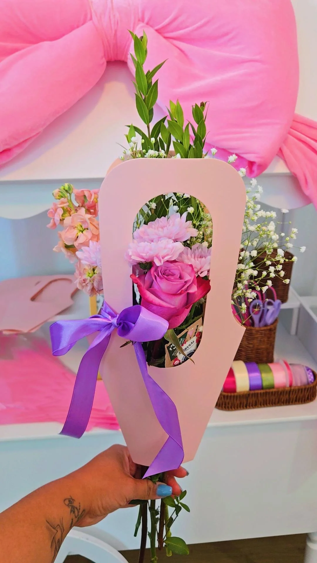 Decor: Your choice of artificial flowers or a large pink bow.