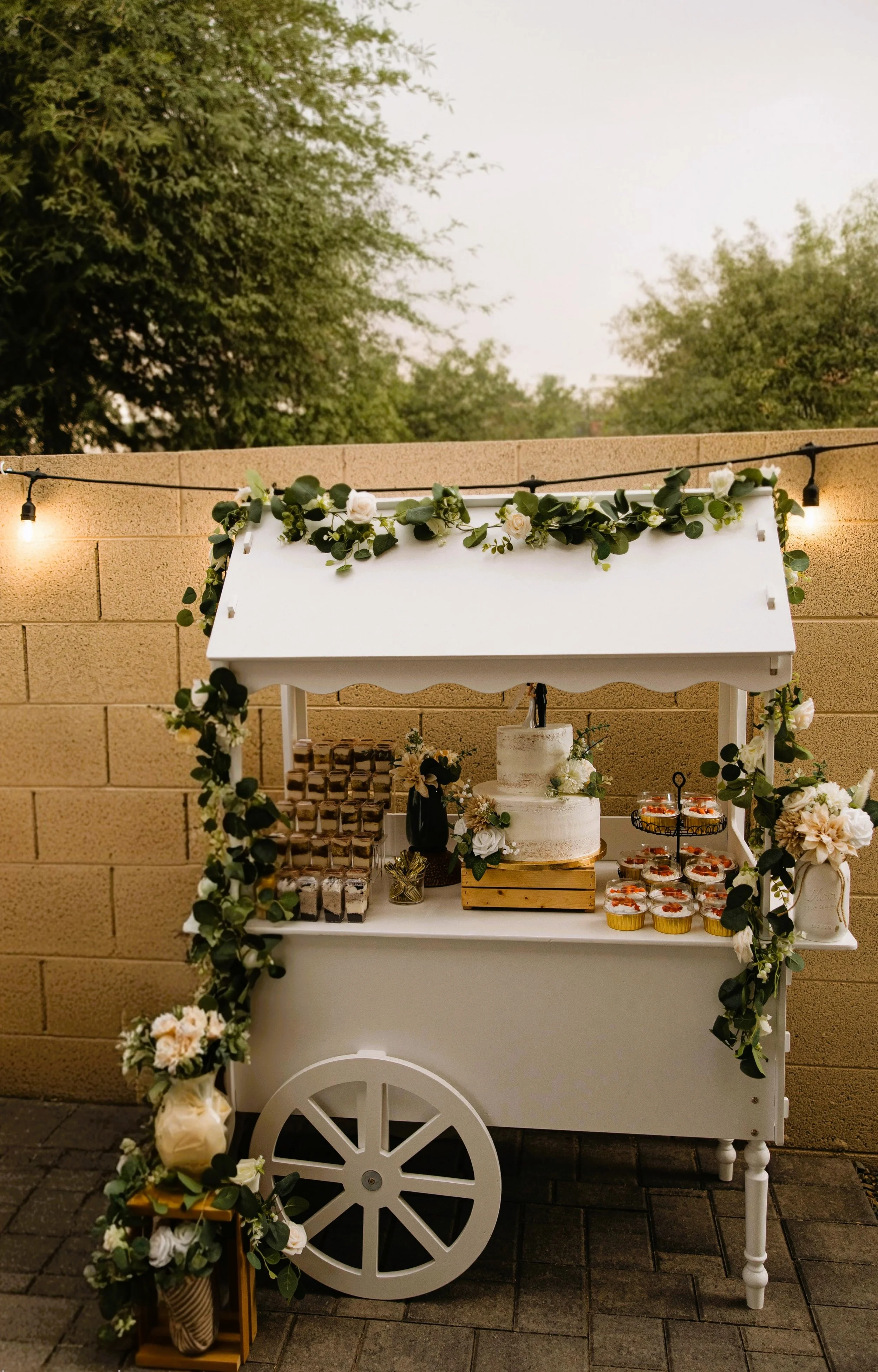 Our charming dessert cart comes fully decorated and ready to impress! Use it as a dessert table, mimosa bar, snack station, or beverage cart for your event.