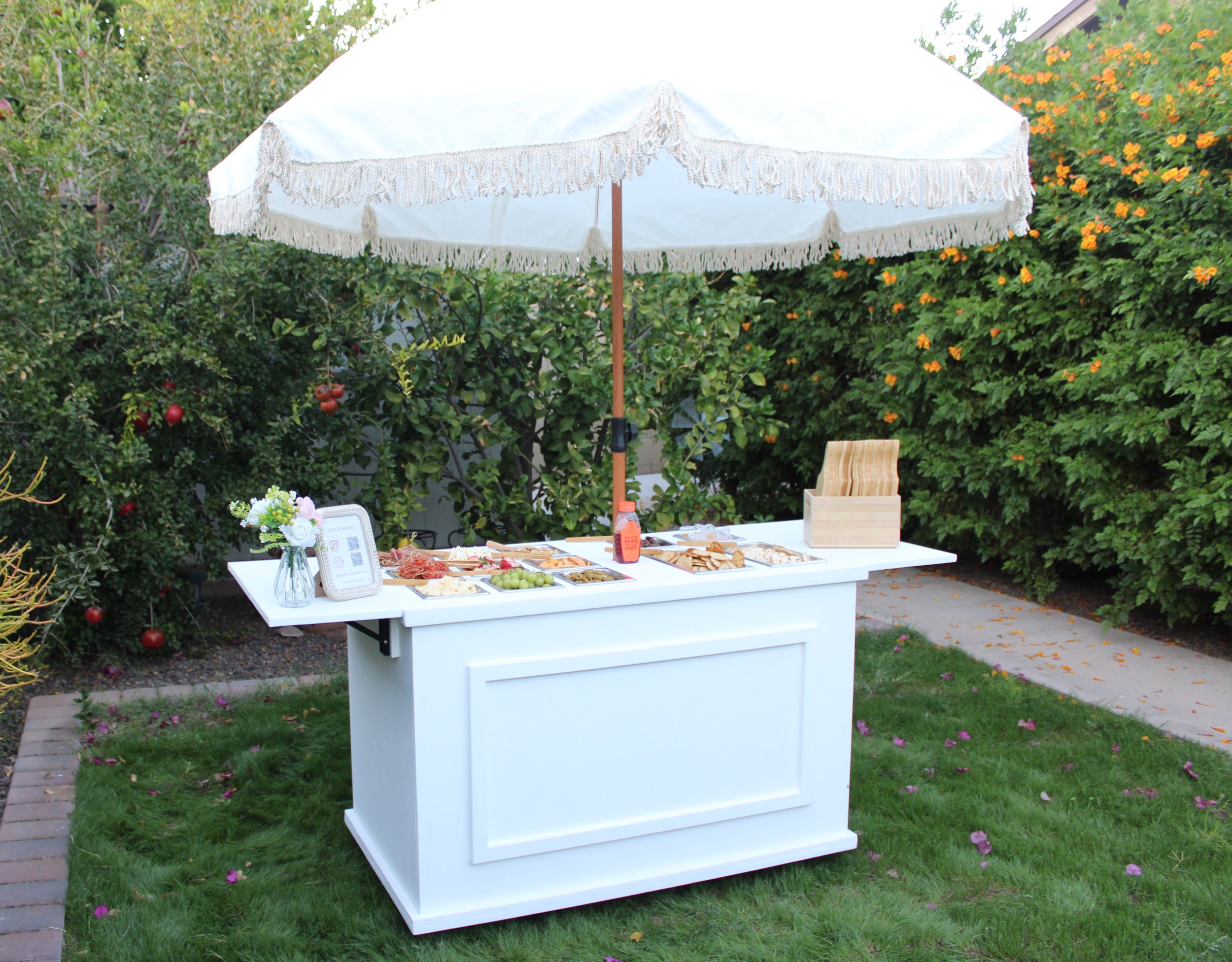 Bring the wow factor to your next event! Our Charcuterie Cart is set up with all serving containers and umbrella. Perfect for charcuterie, snack stations, or light bites. Full Charcuterie can be included!